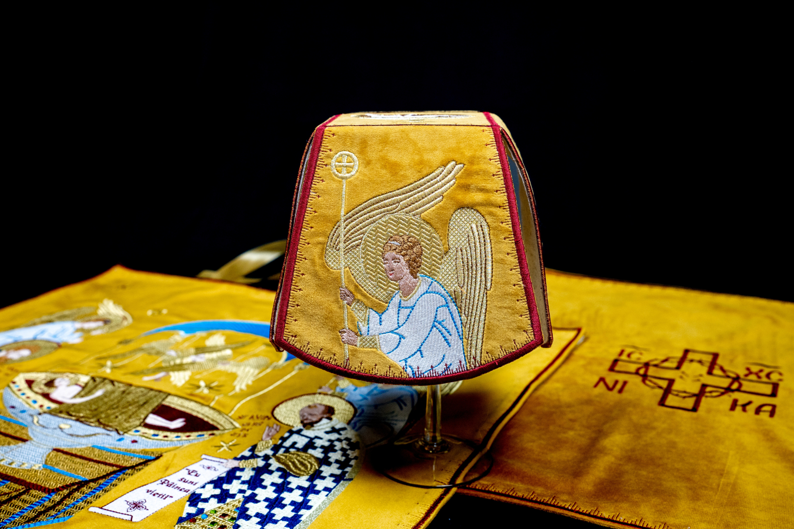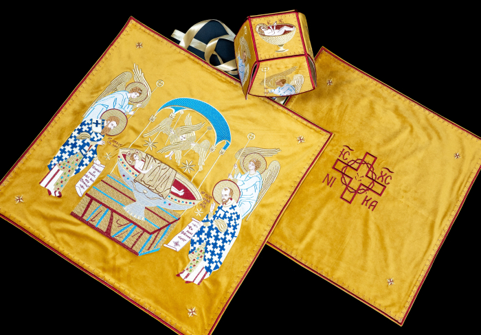 Set complet de acoperaminte pentru sfintele vase ( Sfant aer , Disc, Potir) broderie de matase pe catifea de inalta calitate.