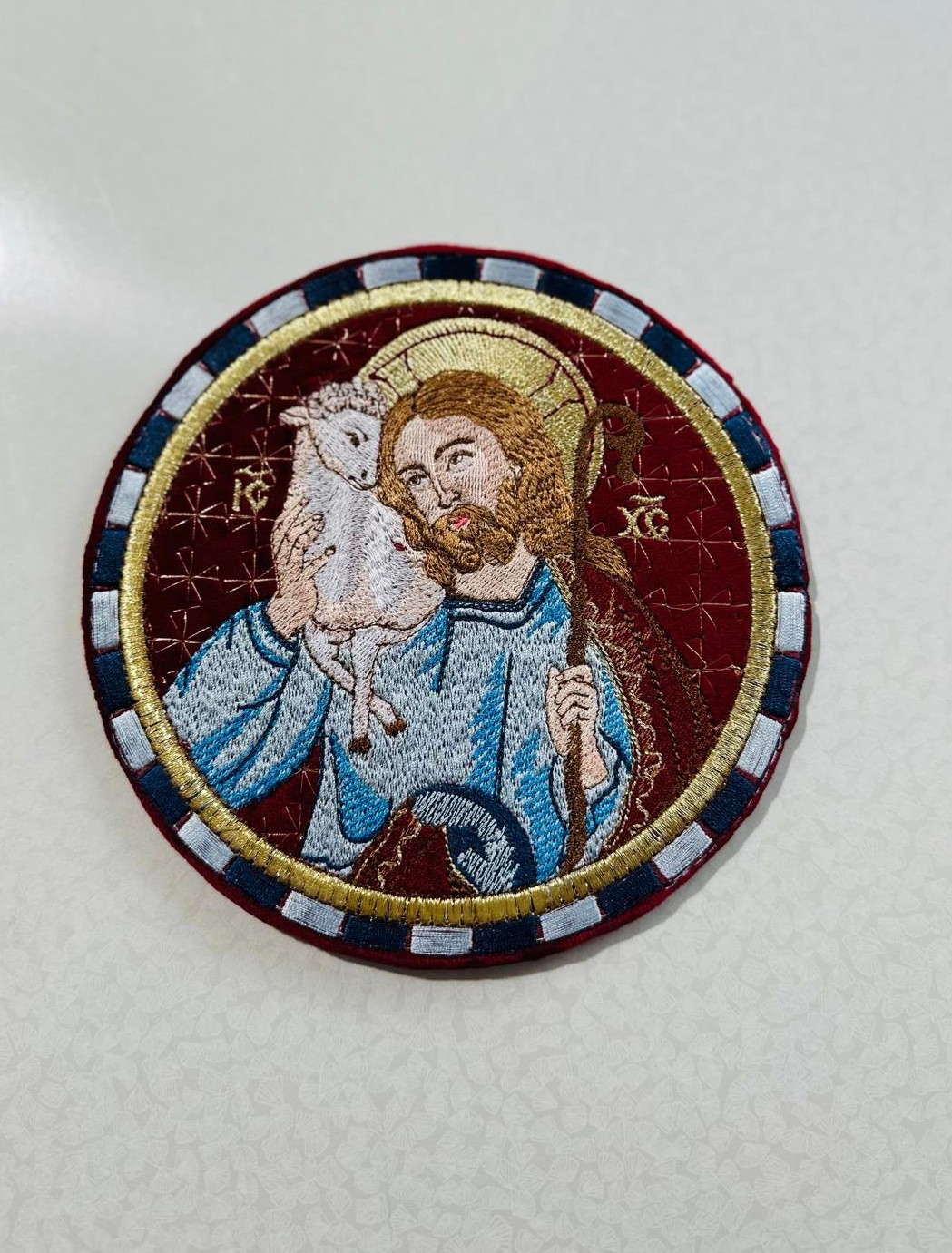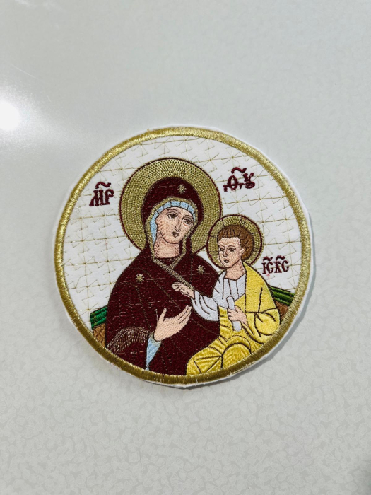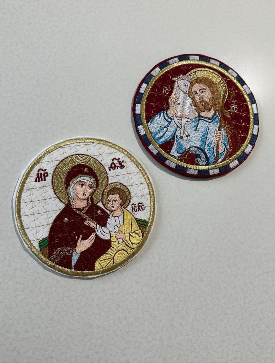 Set de 2 ripide brodate – Maica Domnului cu Pruncul și Mântuitorul Iisus Hristos – realizate pe catifea de calitate, cu fir metalic și detalii fine.