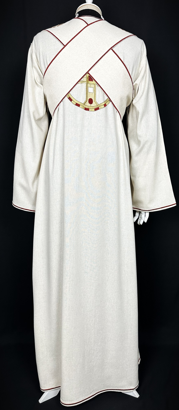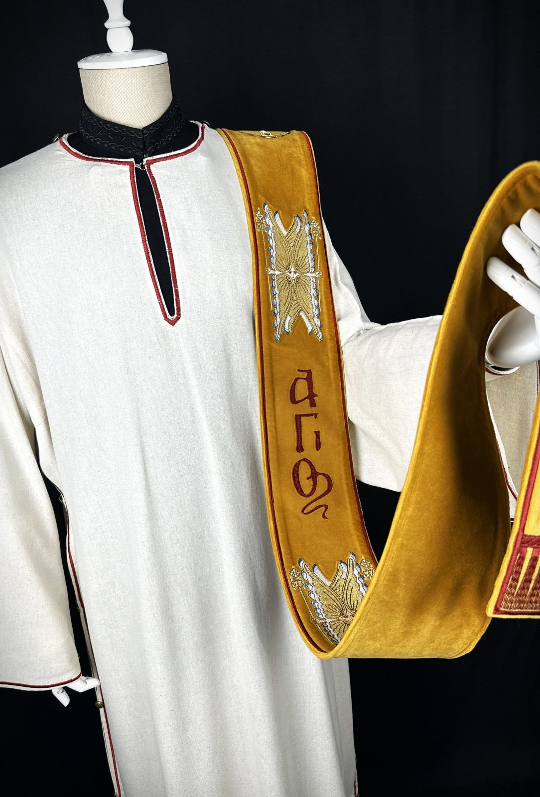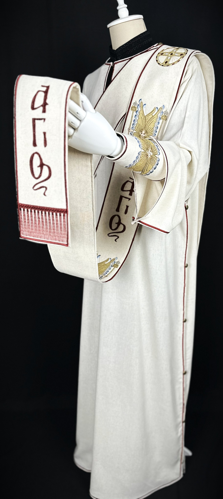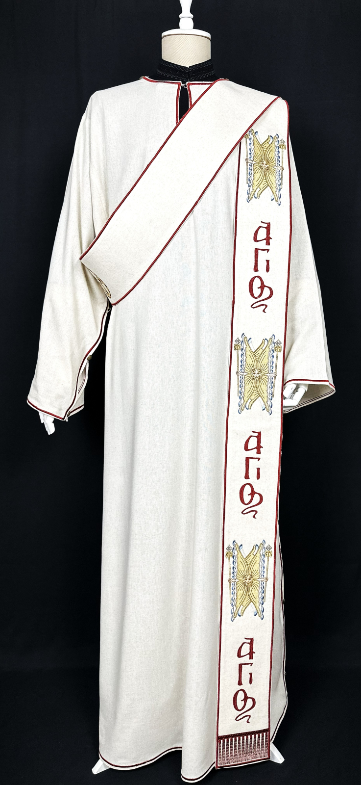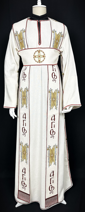 Veșmânt pentru diacon realizat  din țesătură din in combinată cu bumbac, respirabilă, plăcută la atingere si potrivită pentru purtare îndelungată.