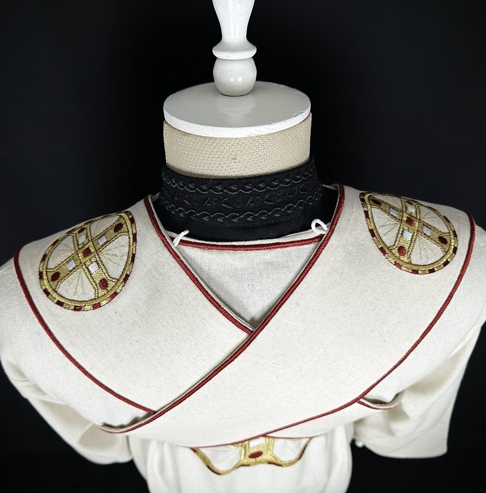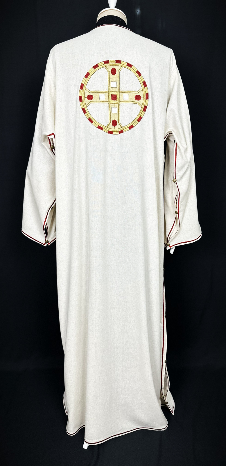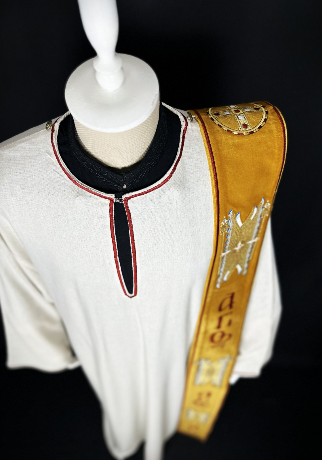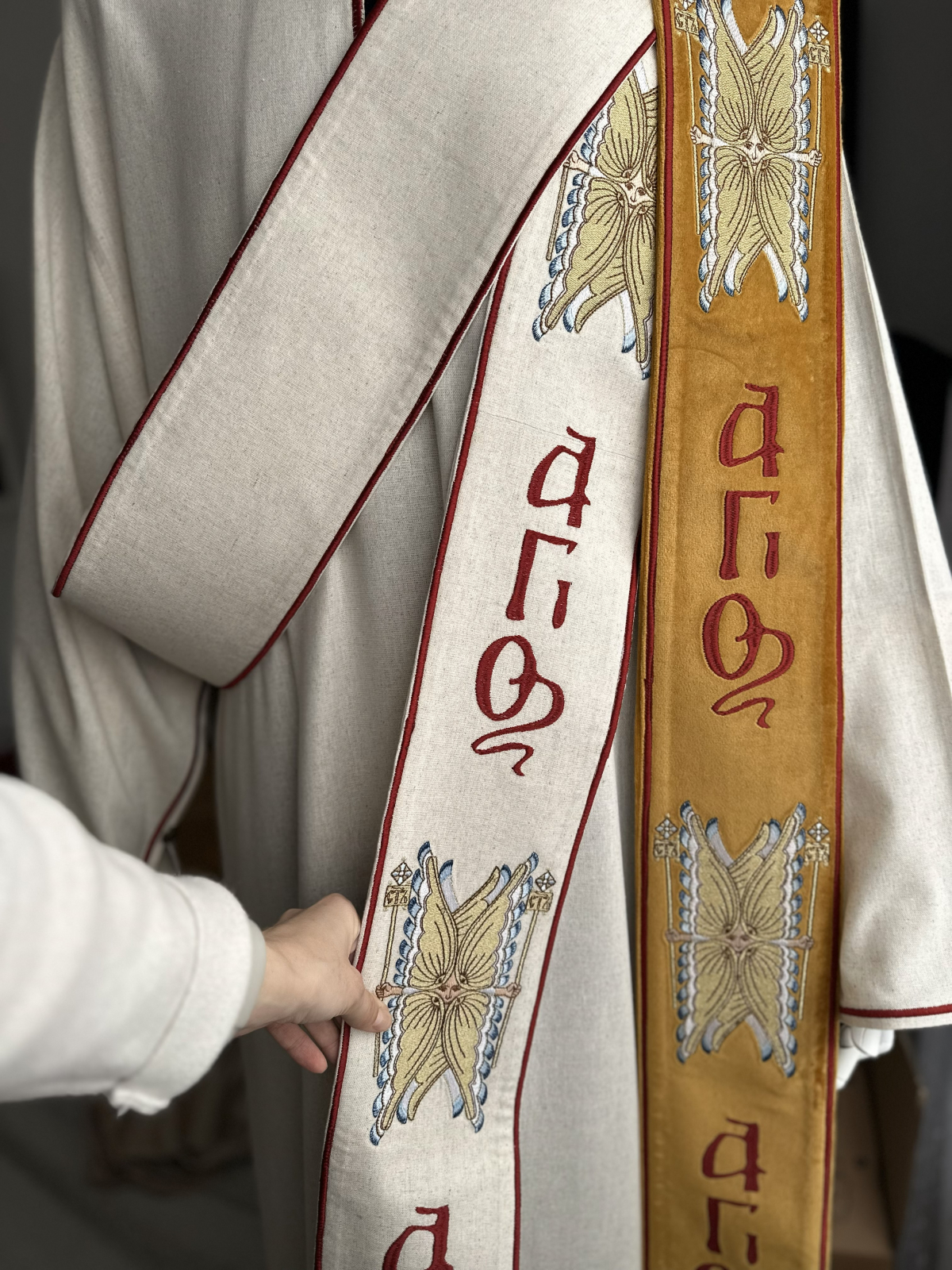 Veșmânt pentru diacon realizat  din țesătură din in combinată cu bumbac, respirabilă, plăcută la atingere si potrivită pentru purtare îndelungată.