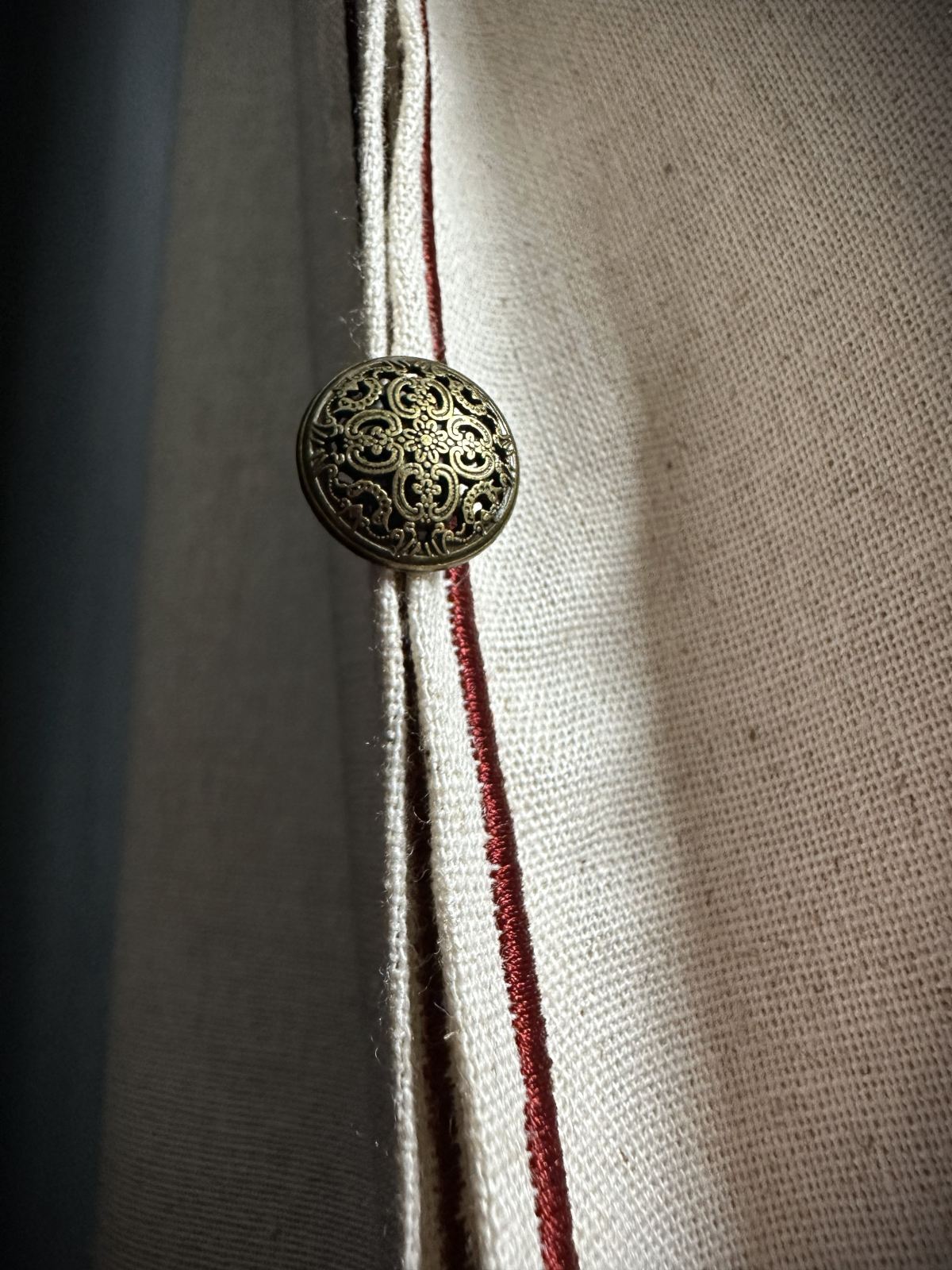 Primul set, realizat din aceeași țesătură de in cu bumbac,  brodat cu fir metalic și fir de mătase, cu motive tradiționale liturgice, atent proporționate.