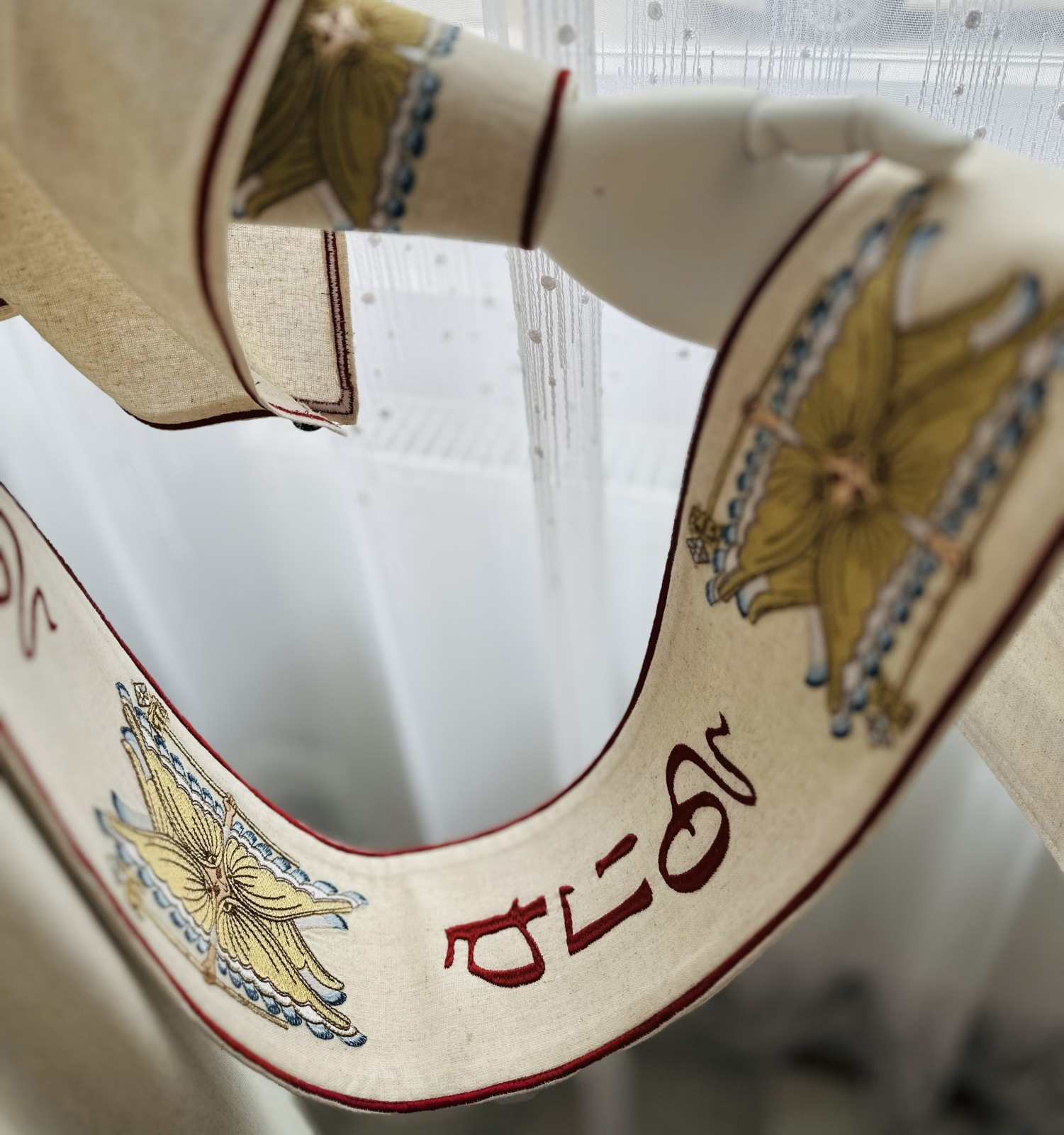 Broderia este realizată cu grijă, punând în valoare simbolurile liturgice, în special serafimii – îngerii cei mai apropiați de tronul lui Dumnezeu, simbol al curăției, al focului dumnezeiesc și al slujirii neîncetate. Prezența lor în broderie amintește de chemarea diaconului la slujire curată, atentă și plină de râvnă în Sfântul Altar, asemenea slujirii îngerești.