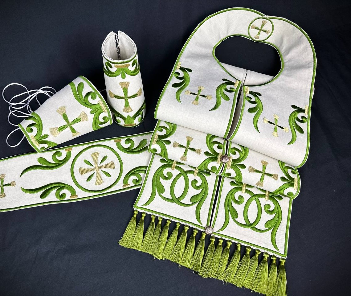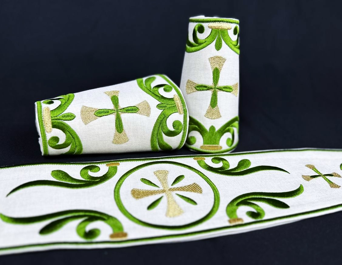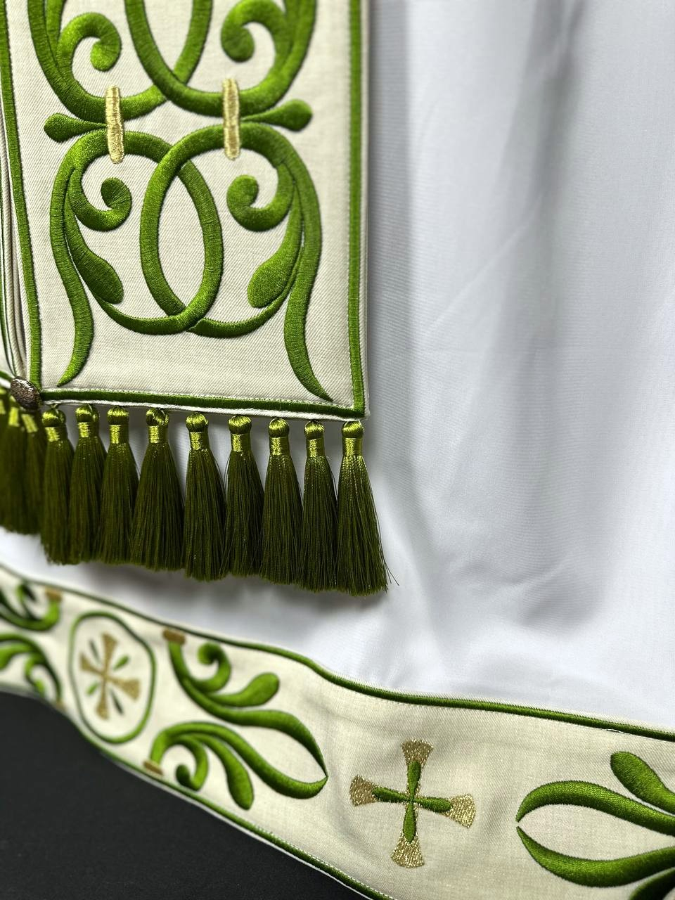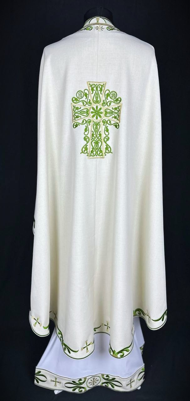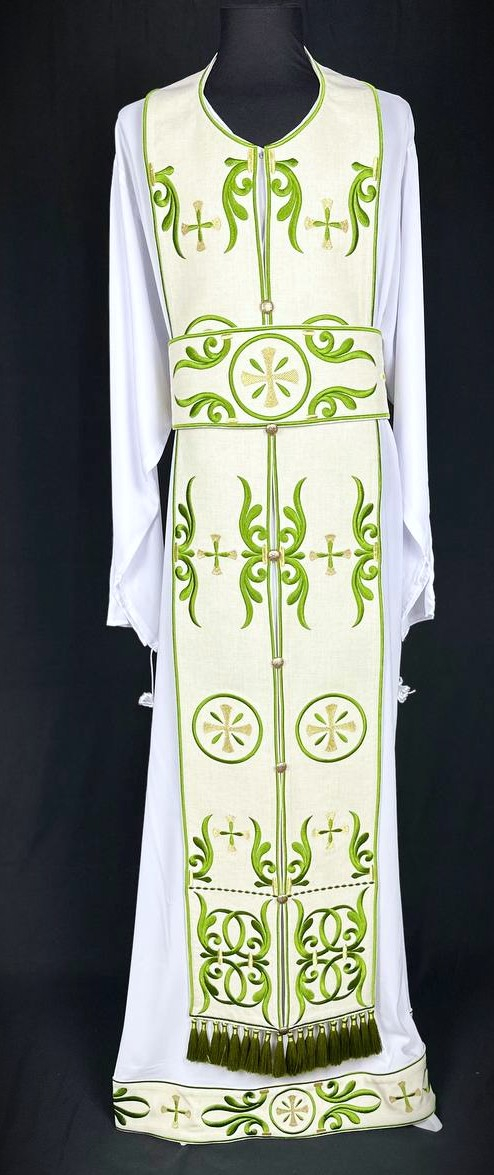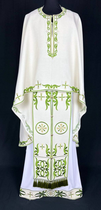 Acest veșmânt brodat este o piesă unicat, realizată integral în atelierul nostru, cu atenție la fiecare detaliu. Modelul broderiei a fost creat de noi.