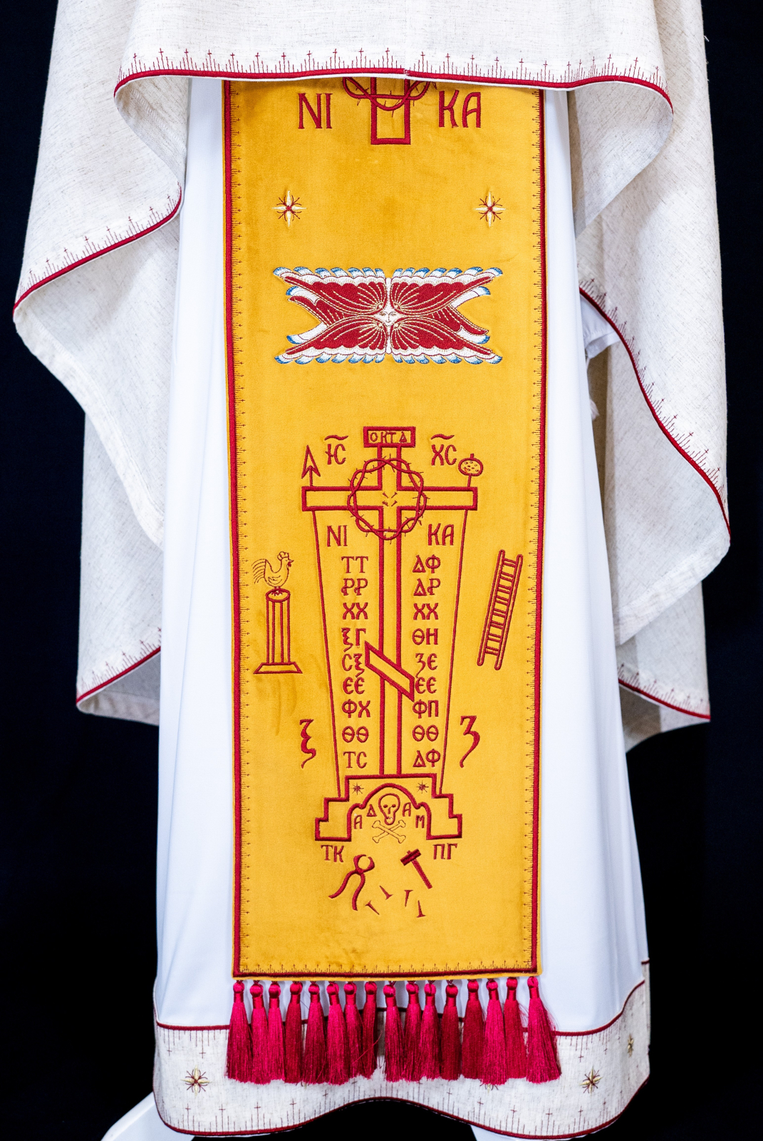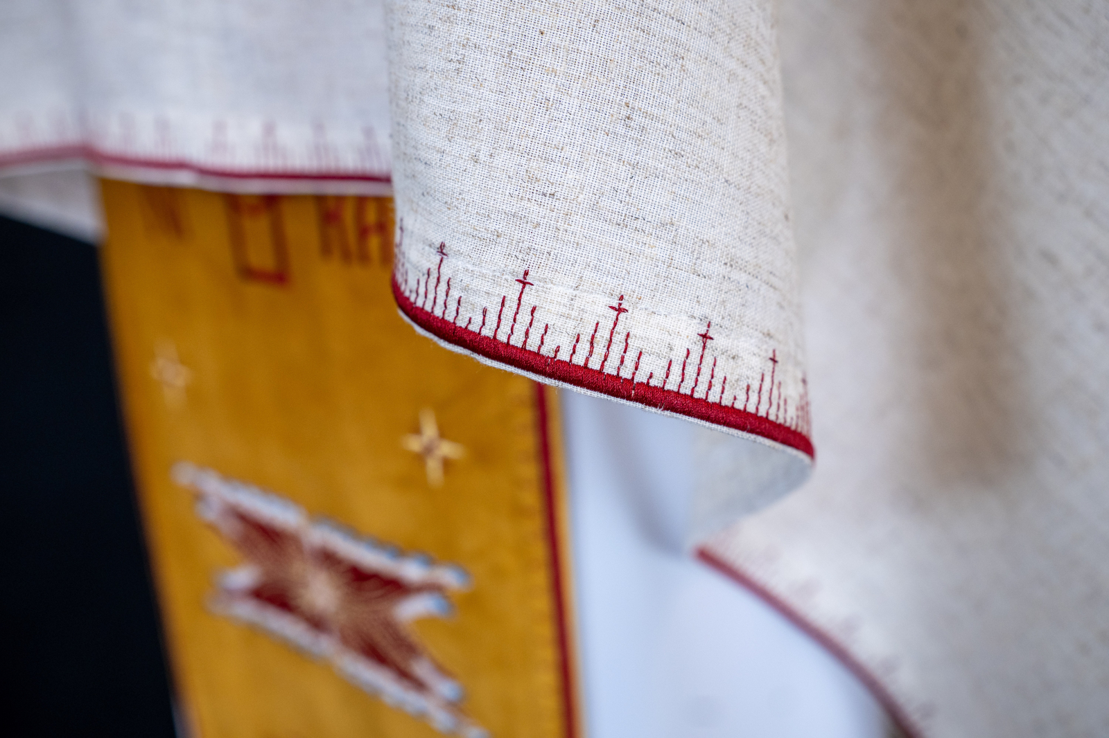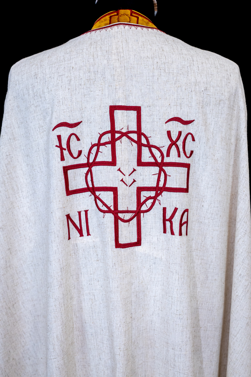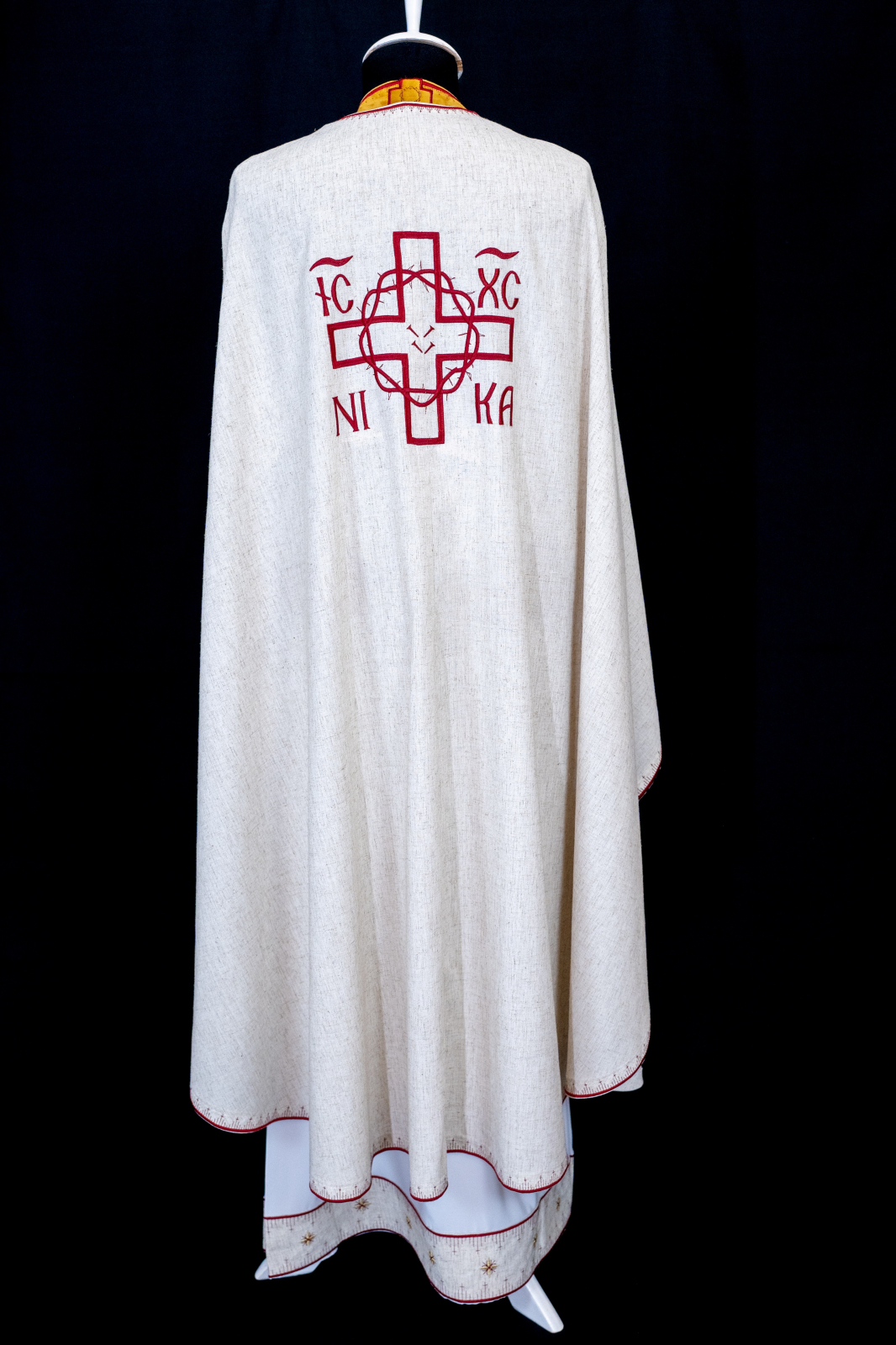 Acest set de veșminte preoțești este realizat cu grijă și atenție la detalii în atelierul nostru, fiind un model unicat. Felonul este confecționat din in natur, un material plăcut și așezat, care oferă simplitate și eleganță în același timp. Epitrahilul, mânecuțele și brâul sunt lucrate din catifea, adăugând un contrast plăcut și o notă caldă întregului ansamblu.