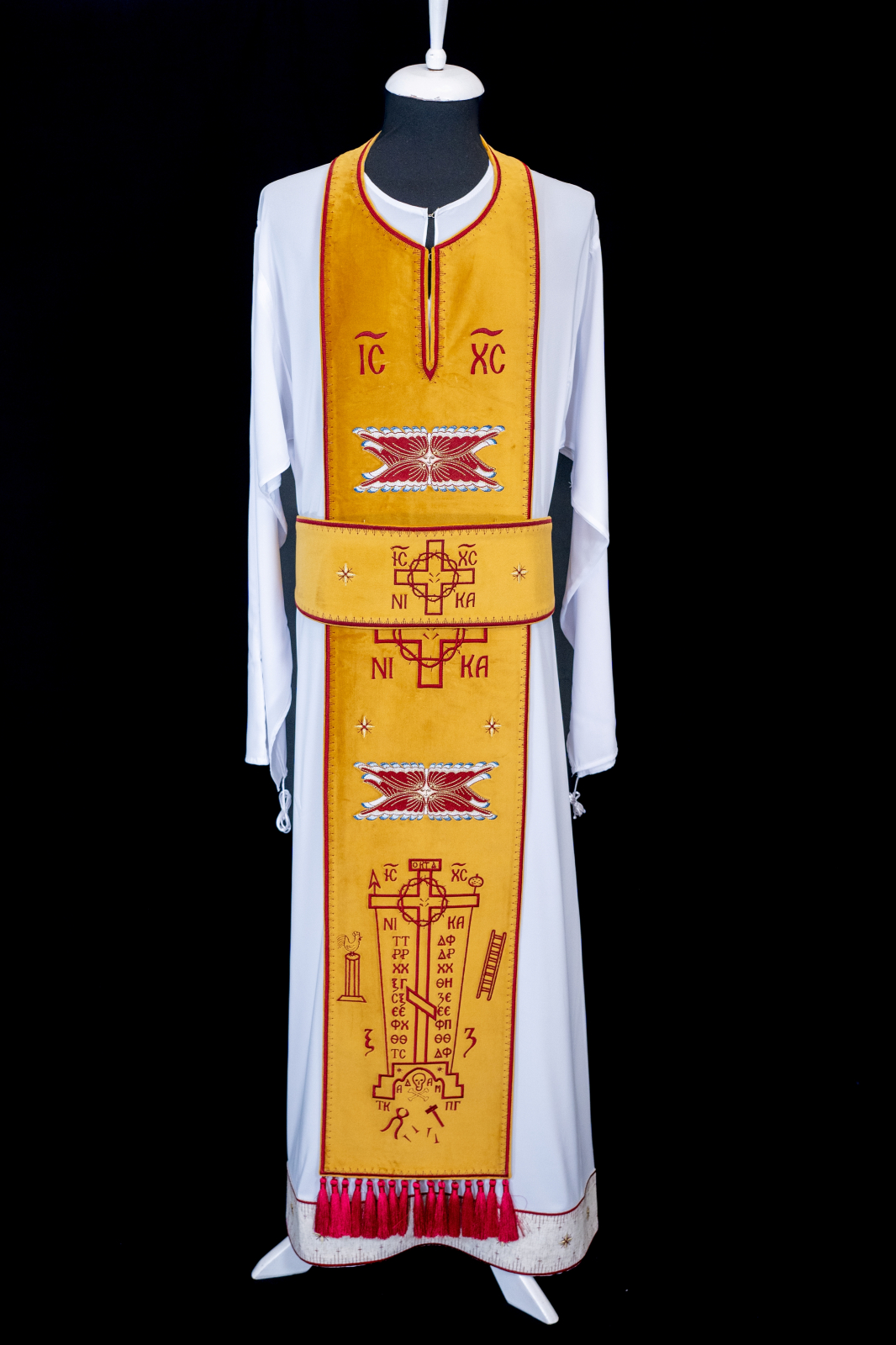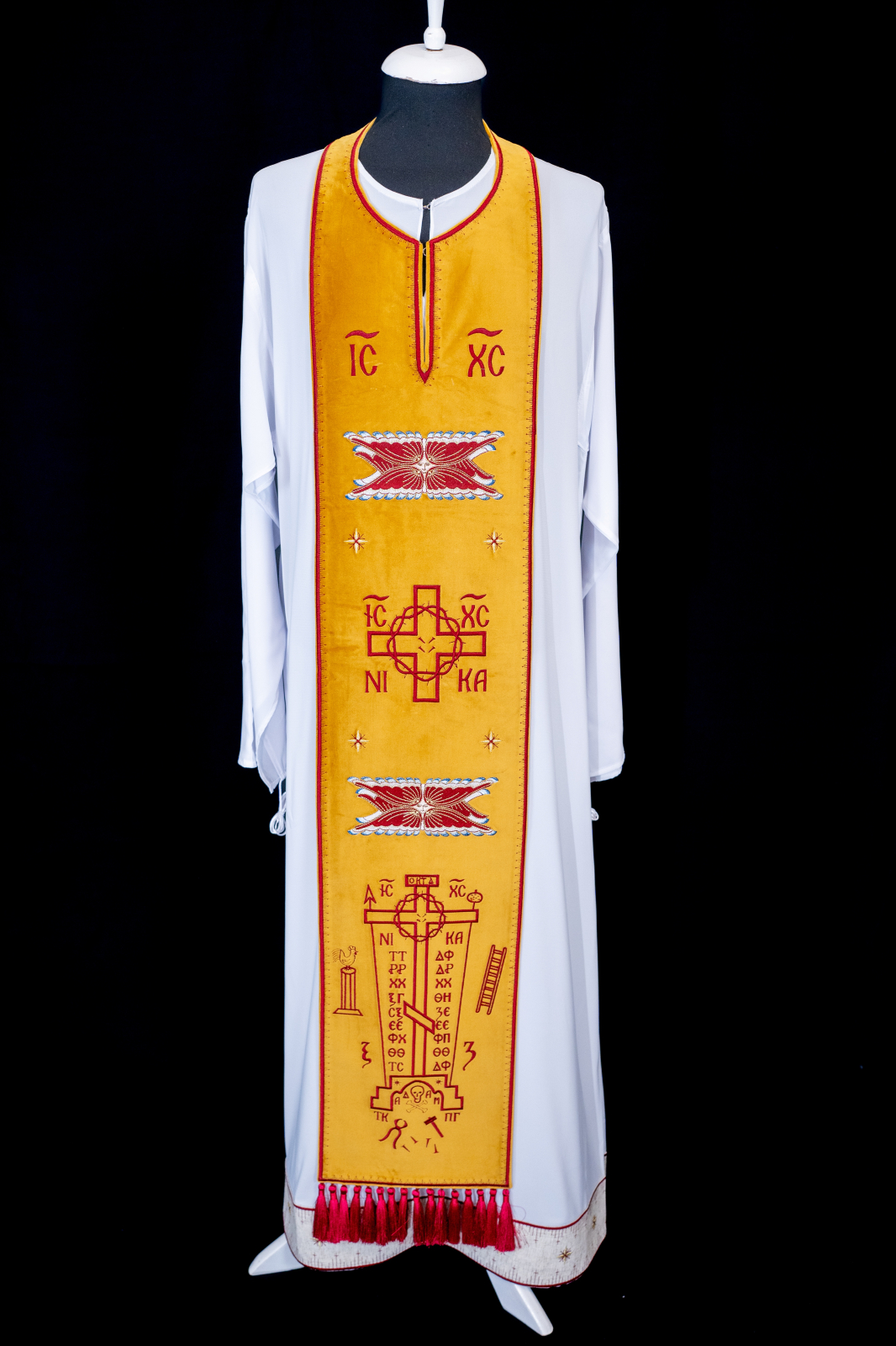 Modelul prezentat este creat în întregime în atelierul nostru și ne dorim ca fiecare lucrare să fie adaptată după dorințele și nevoile fiecărui client în parte. Ne dorim sa realizam modele unicat, concepute și personalizate la cererea clientului, pentru ca fiecare veșmânt să fie special și să reflecte cu adevărat rostul și frumusețea slujirii.
