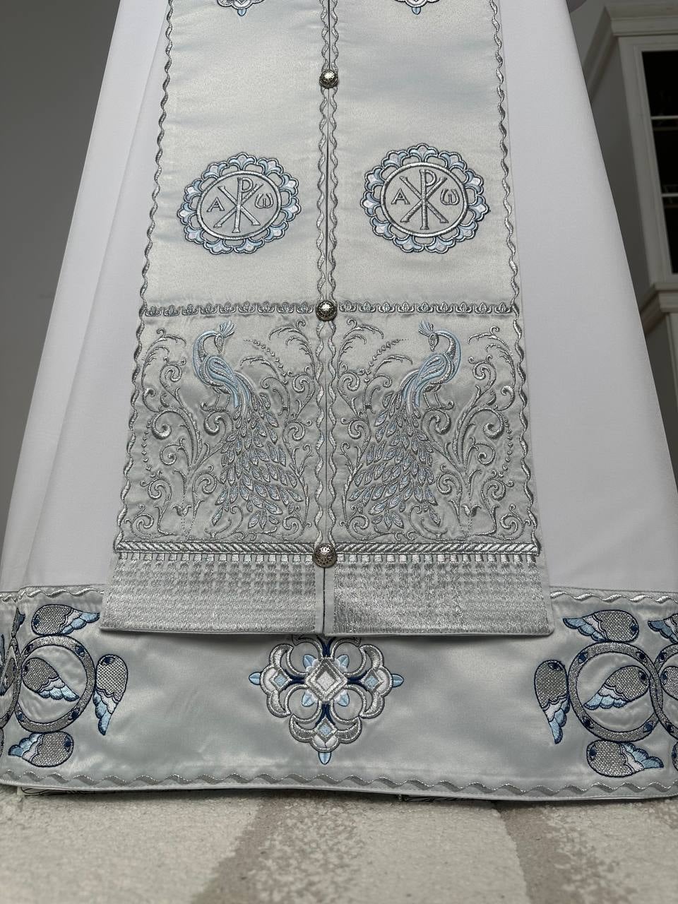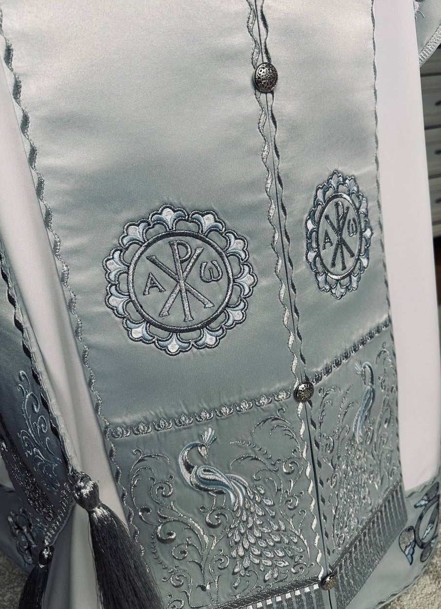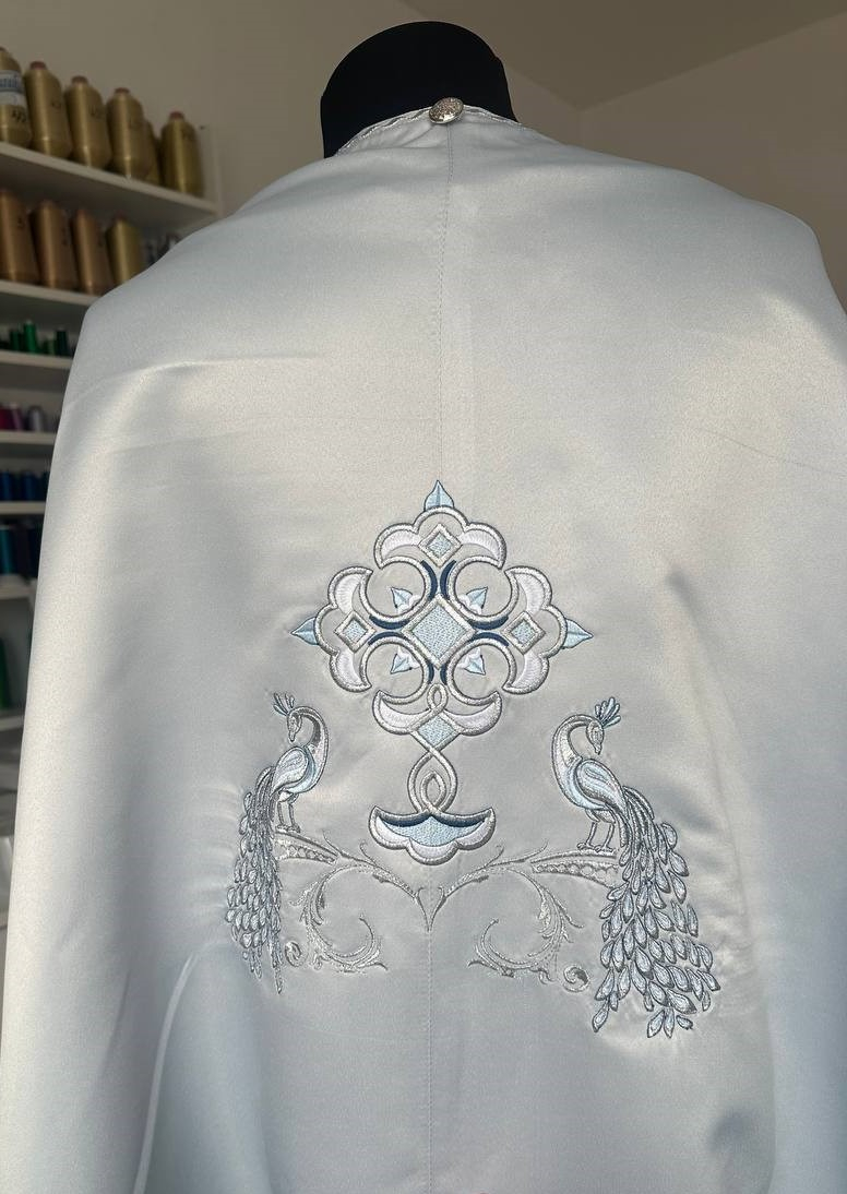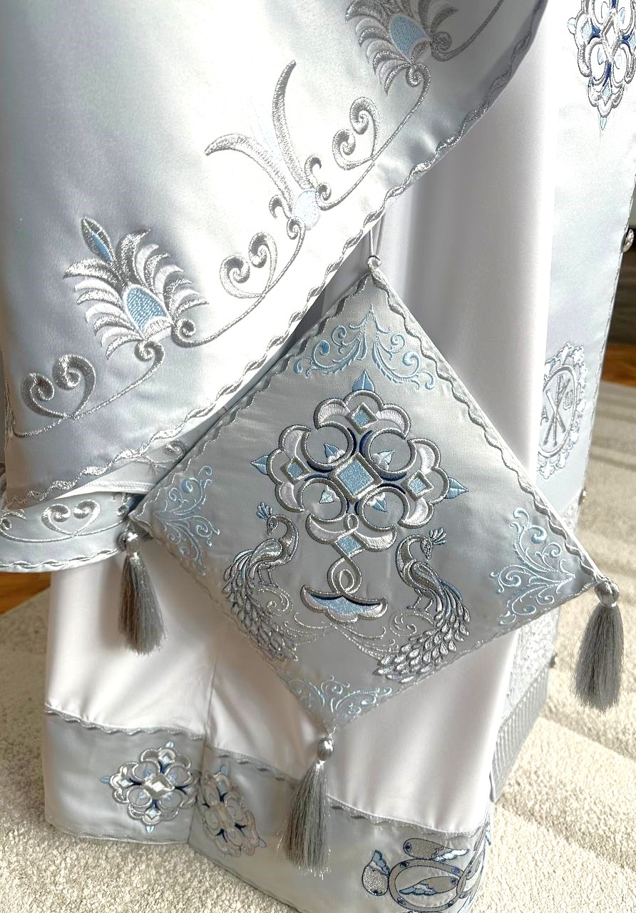 Model elegant realizat pe tafta, brodat cu fir metalic argintiu și fir de mătase albastru deschis. Veșmântul poate fi confecționat pe orice culoare și din orice material. Modelul broderiei poate fi adaptat sau modificat în funcție de preferințele fiecăruia. (bedernita este inclusa in pret)