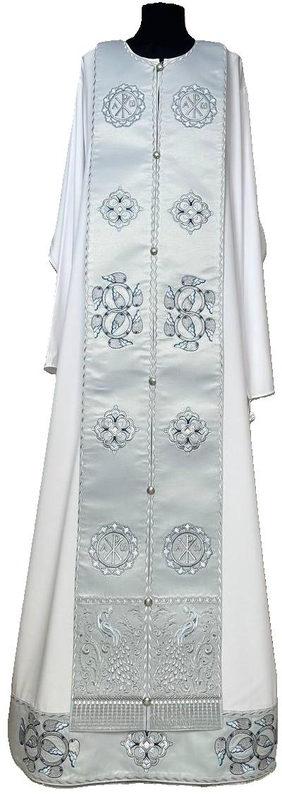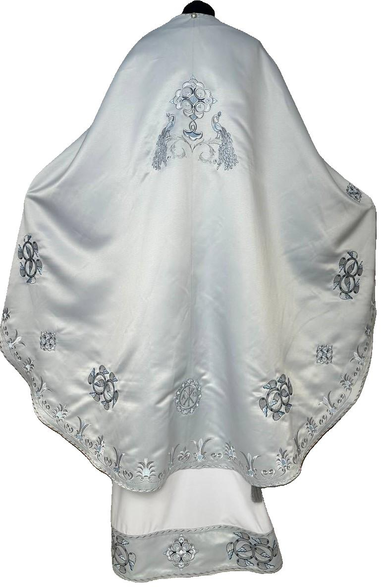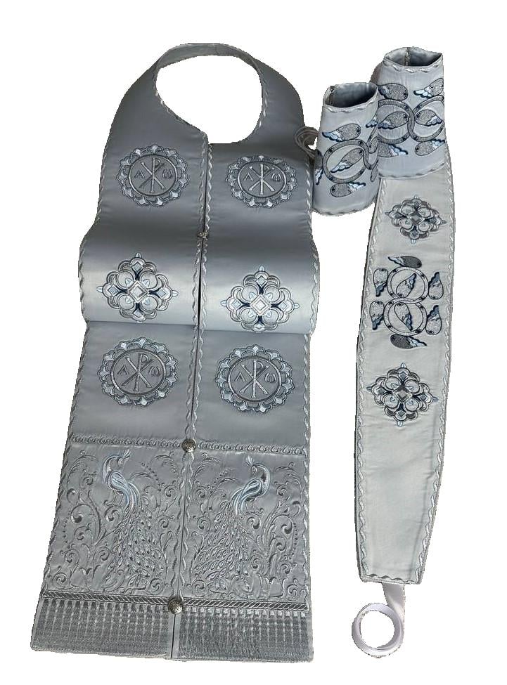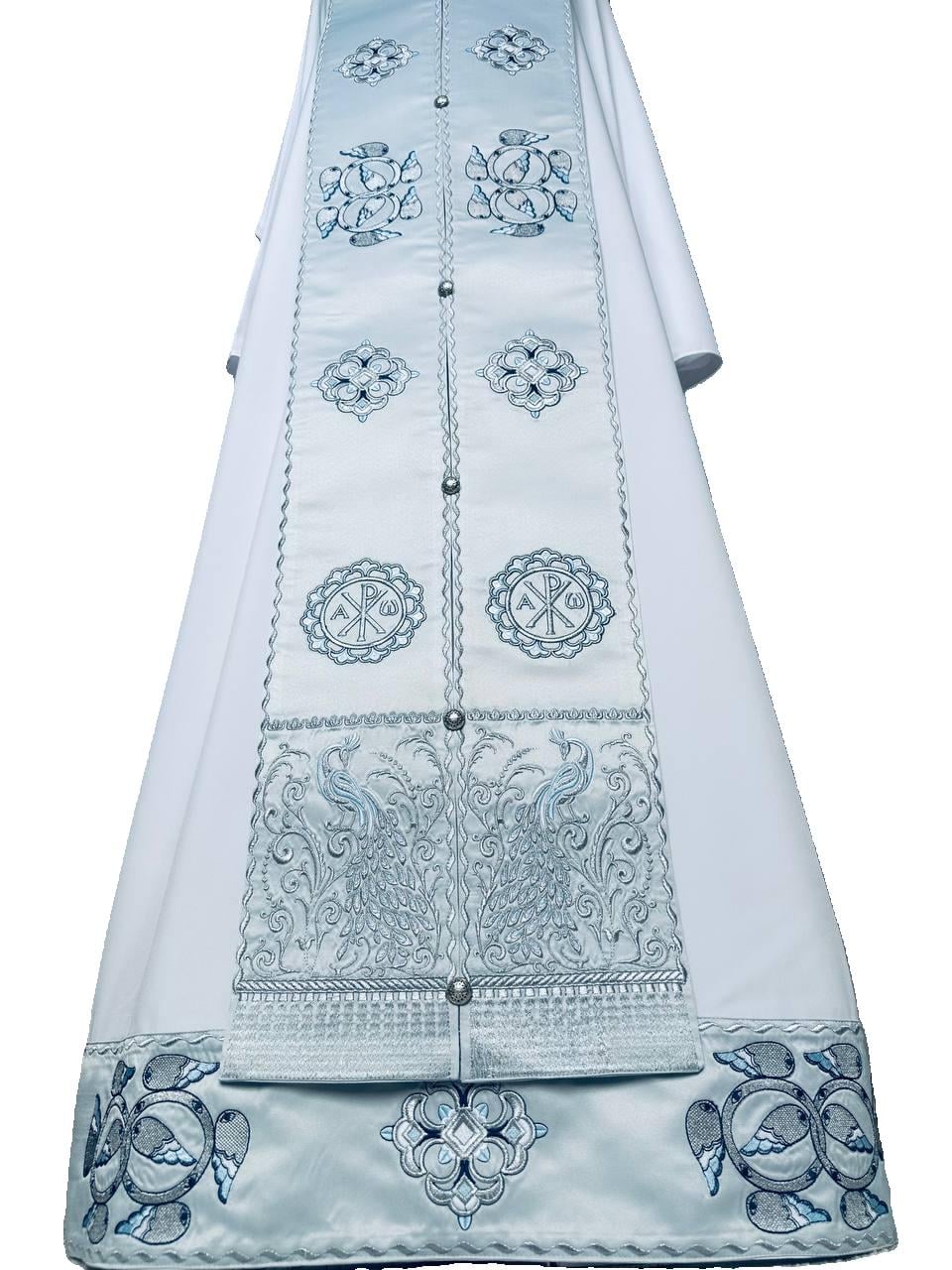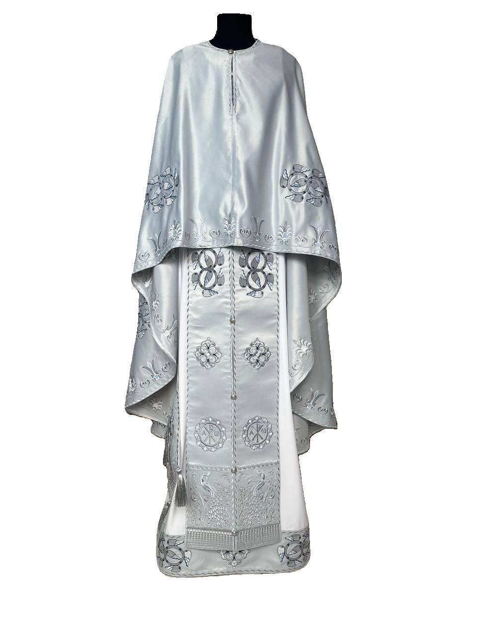 Model elegant realizat pe tafta, brodat cu fir metalic argintiu și fir de mătase albastru deschis. Veșmântul poate fi confecționat pe orice culoare și din orice material. Modelul broderiei poate fi adaptat sau modificat în funcție de preferințele fiecăruia. (bedernita este inclusa in pret)